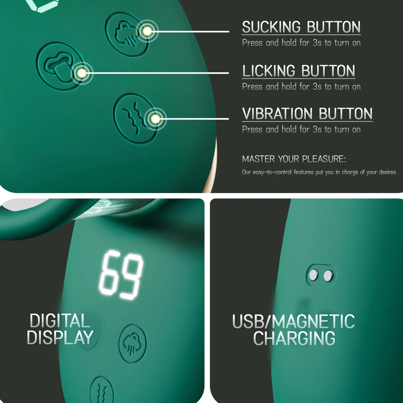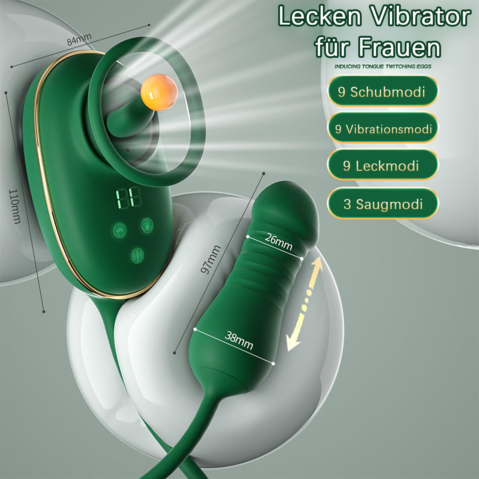 Functions: 9 licking modes, 3 suction intensities, 9 thrusting patterns