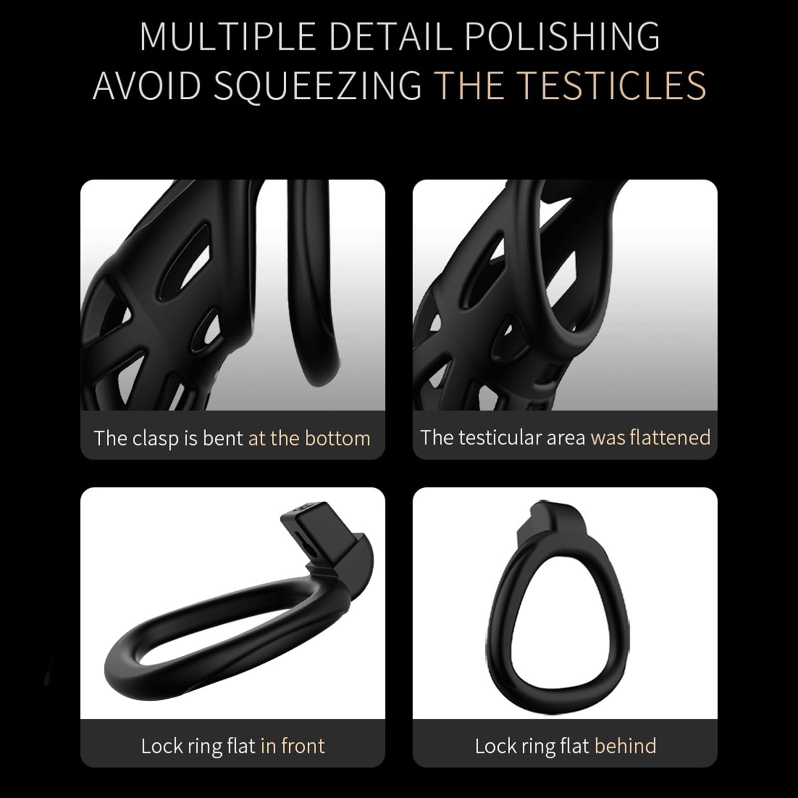 The package includes three cuff rings to ensure a tailored fit for different body types. This flexibility makes the black chastity cage suitable for a wide range of users, balancing comfort with secure restraint for prolonged wear.