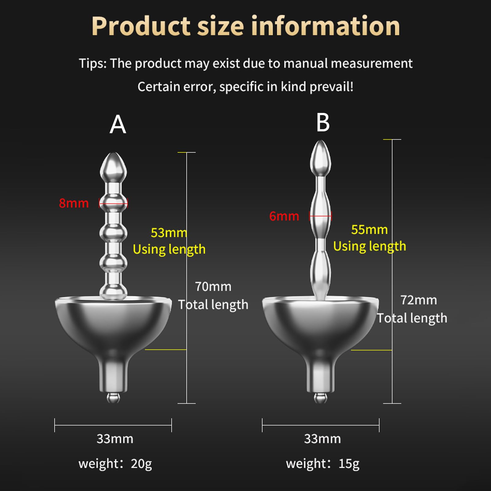 The product specifications and design enhance pleasure and accommodate different needs through its available sizes and bead design. The metal penis plug comes in two sizes (diameters: 6mm/8mm) and features a bead design where different diameter beads provide varying stimulation, significantly enhancing pleasure during use. This allows for tailored experiences based on individual comfort and desired intensity.