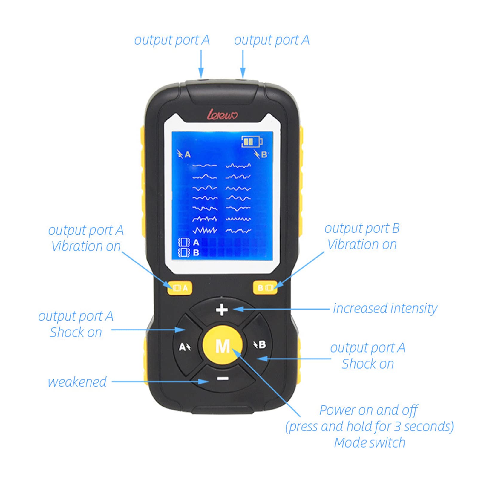Dual-channel control (A/B outputs) allows independent stimulation to two zones.