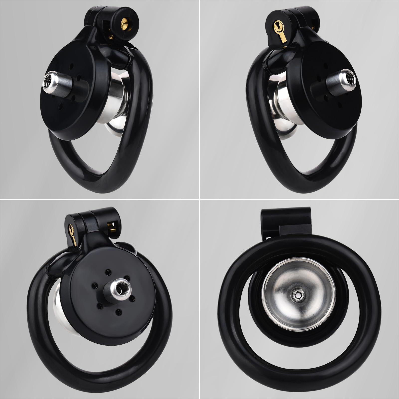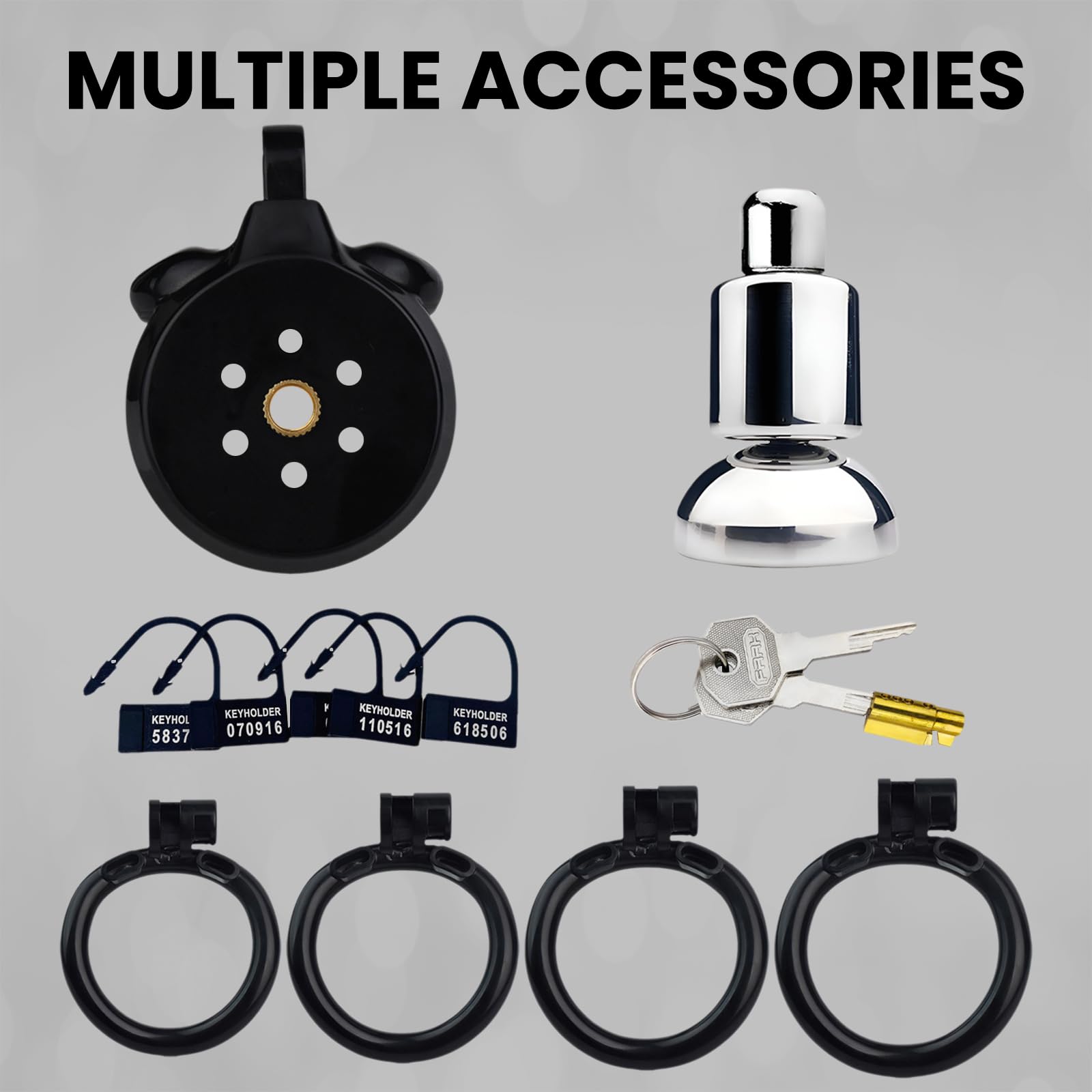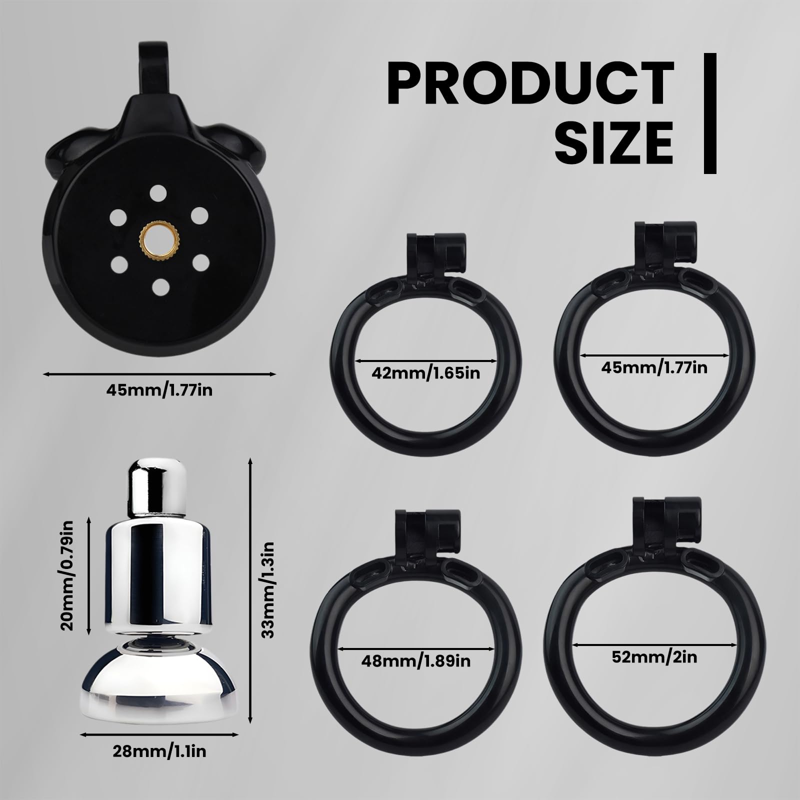 The package includes four base ring sizes (40mm, 45mm, 50mm, 55mm) for a precise fit. This versatility ensures that the male inverted chastity cage adapts to your anatomy, minimizing discomfort while maintaining strict restraint.