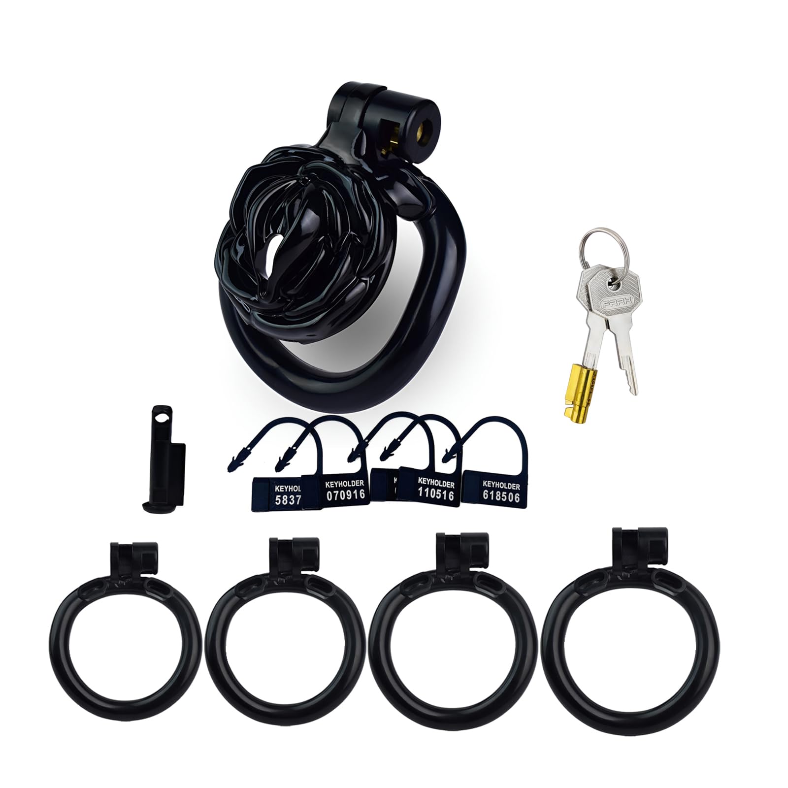 The cock cage set comes with four base ring sizes (42mm, 45mm, 48mm, 52mm), allowing users to find the perfect fit. This range of options ensures secure confinement while minimizing discomfort, accommodating both beginners and experienced users in male chastity training.