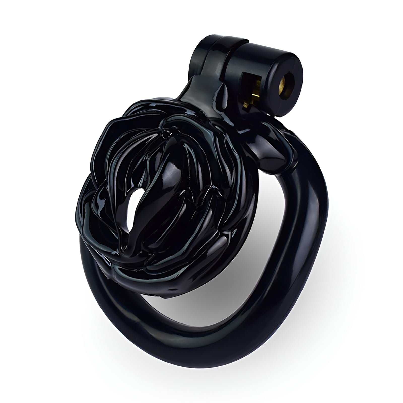This male chastity cage features a sleek, polished texture with a flower-inspired design. Its burr-free finish ensures maximum comfort, while its stylish black appearance elevates the look, making it both discreet and elegant for private or partnered play.