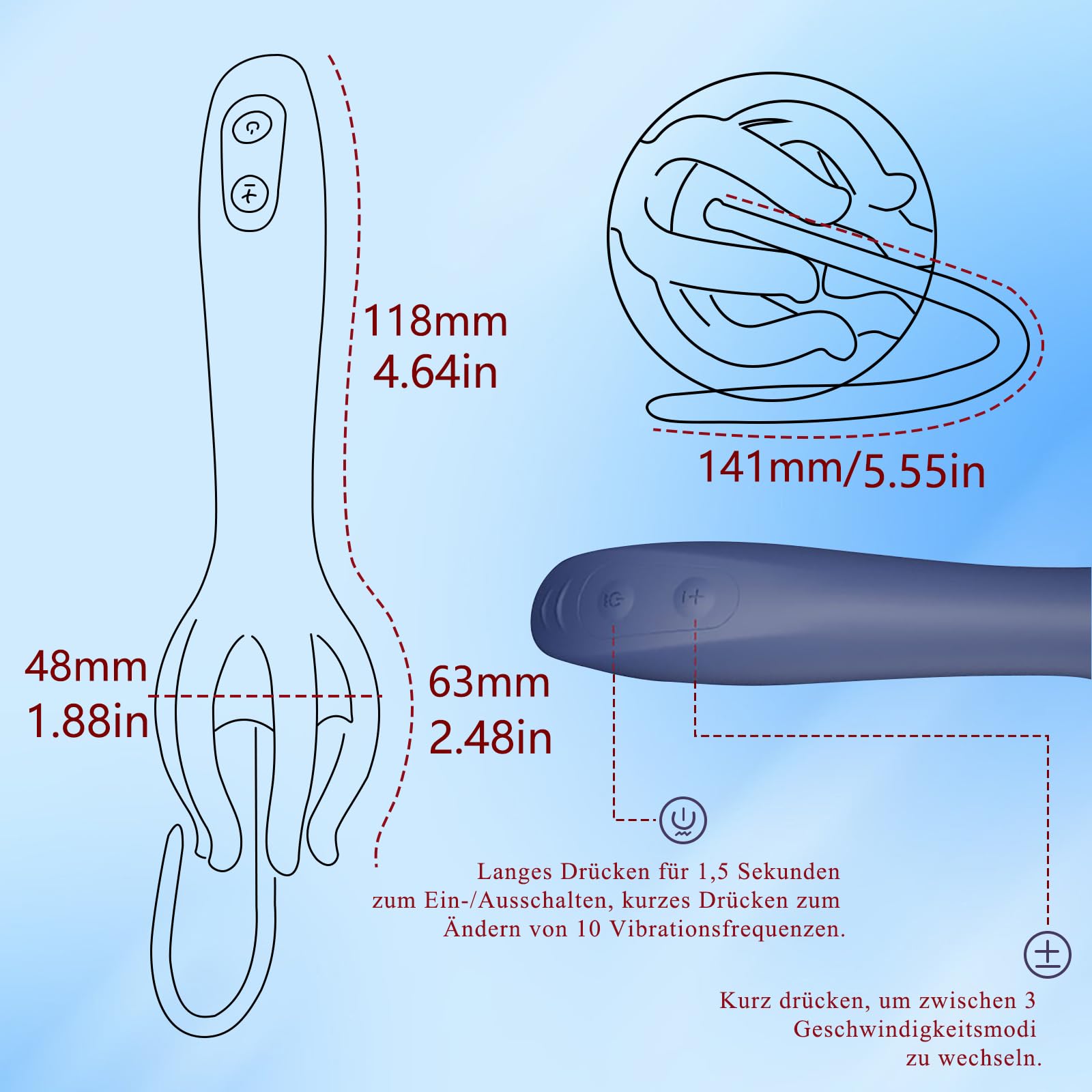 The 2-IN-1 Penis Vibrator & Dilator features 3 speed levels and 10 vibration modes, allowing for 30 unique combinations of sensations. Whether you prefer a gentle tease or intense pulsation, you can customize your experience using the two intuitive control buttons on the handle.