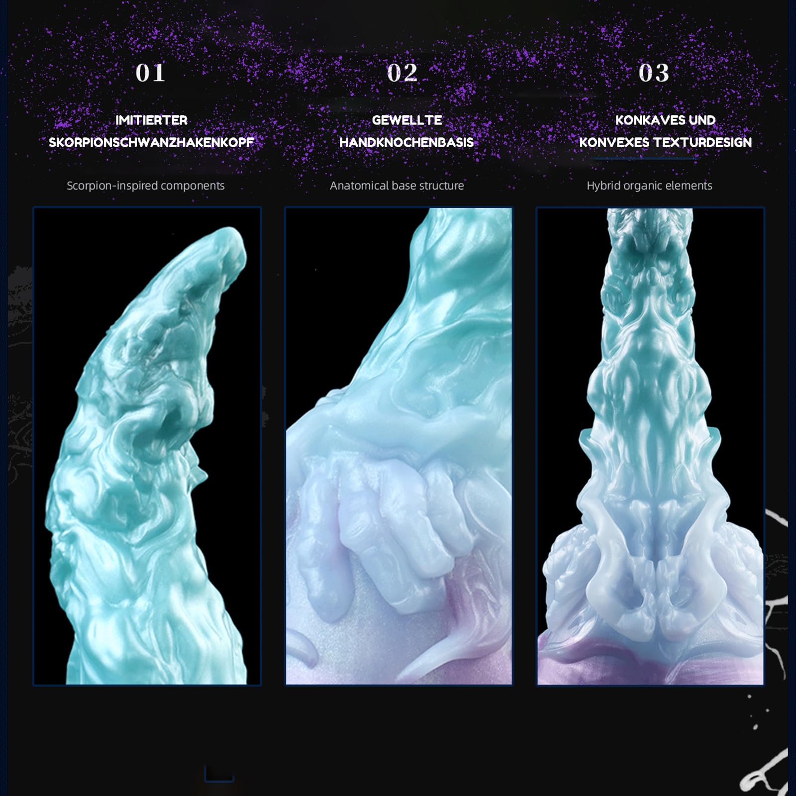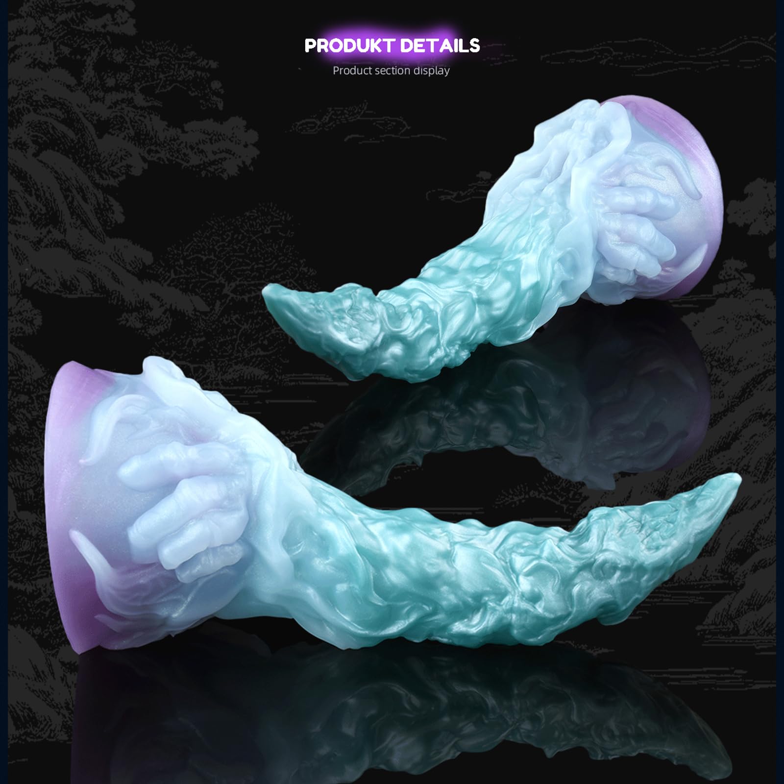 Unlike traditional dildos, this toy features a unique fantasy structure divided into three distinct stimulation zones. The first 5 cm includes a curved scorpion-style tail tip, ideal for stimulating the prostate or G-spot through angled pressure. The mid-shaft area (approx. 9 cm) integrates deer antler-like ridges that create subtle, rhythmic friction as the toy moves. The final section near the base is encircled by a textured ring resembling wrapped cartilage, offering additional surface friction during deep insertion.