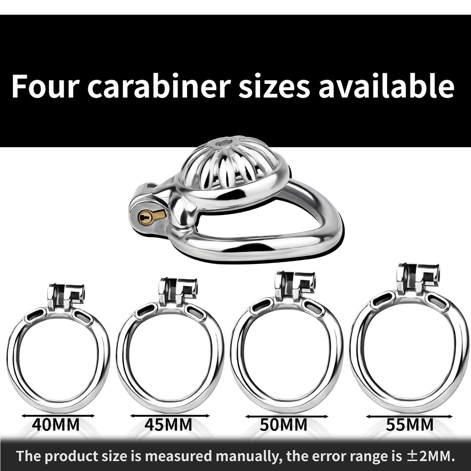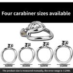 This steel cock cage includes four interchangeable testicle rings (40mm, 45mm, 50mm, 55mm). With multiple sizes available, it provides a secure, tailored fit for various anatomies, ensuring both comfort and effective restriction.