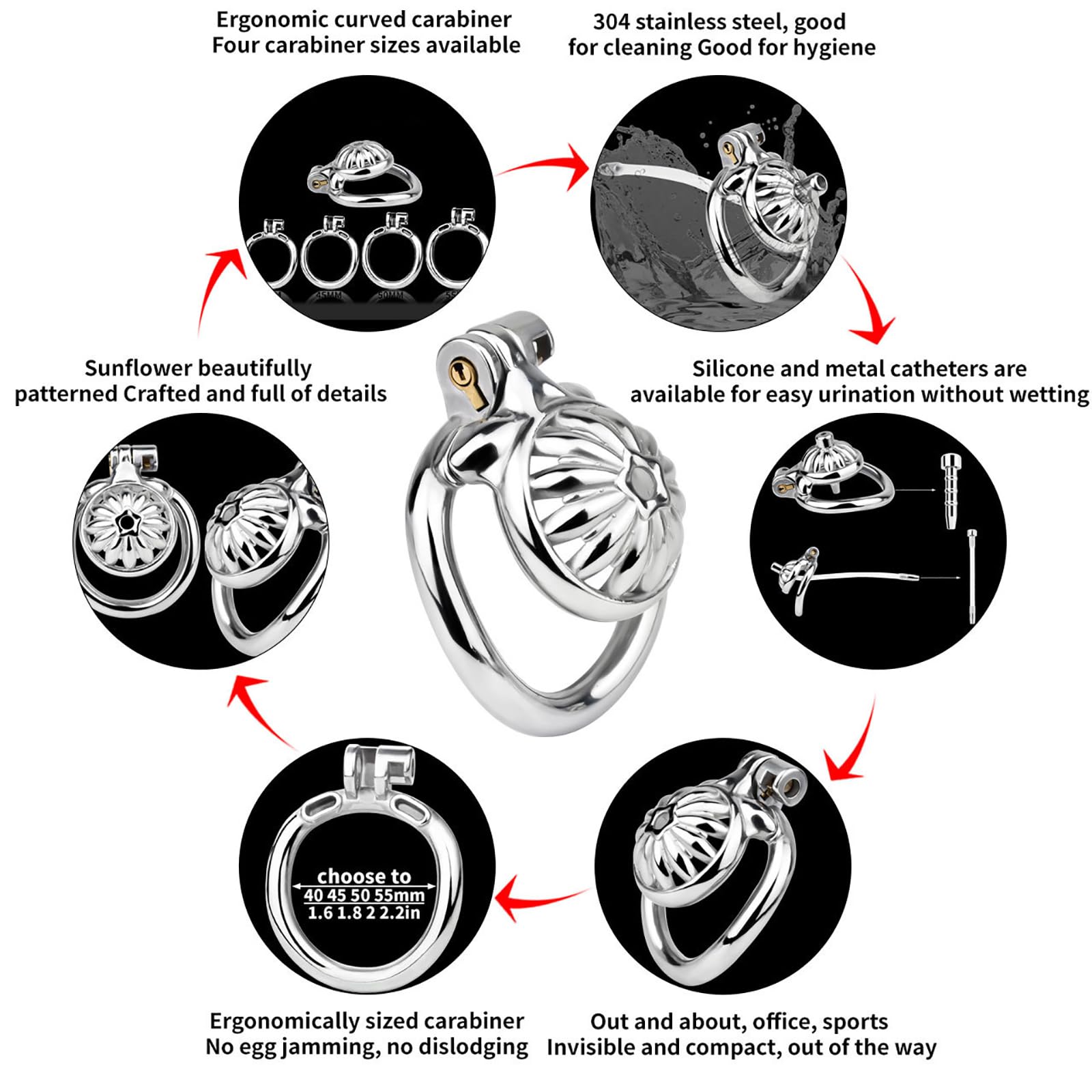 The ventilated hollow design prevents heat and sweat buildup, while the included hollow urethral dilator allows for unrestricted urination during wear. This makes these metal cock cages practical for extended or 24/7 chastity use.