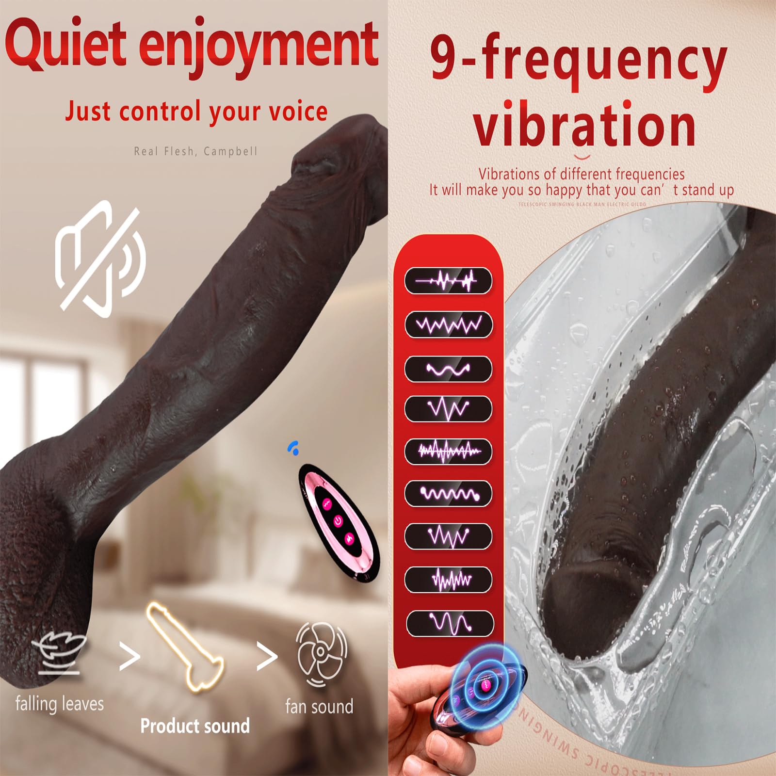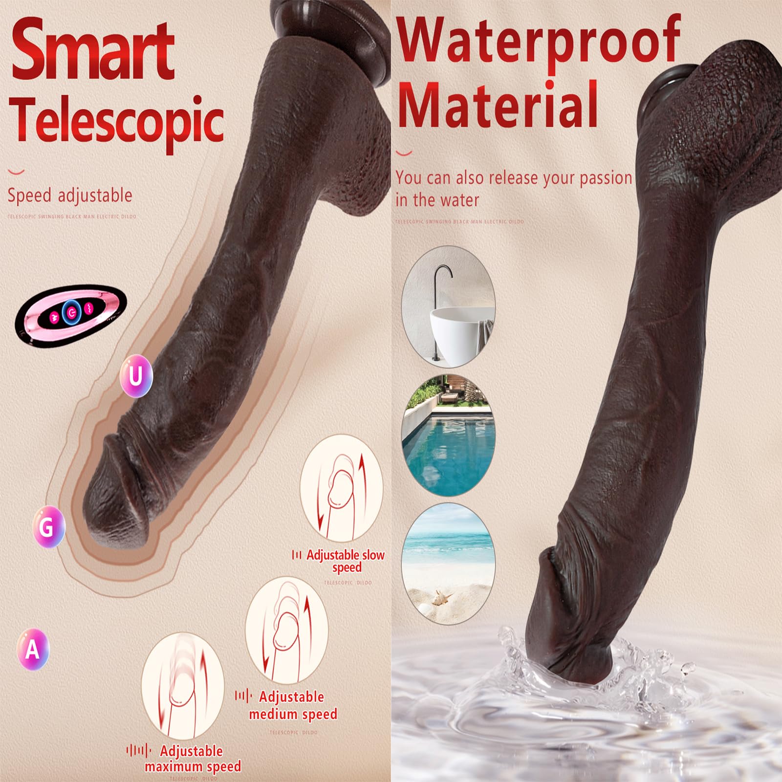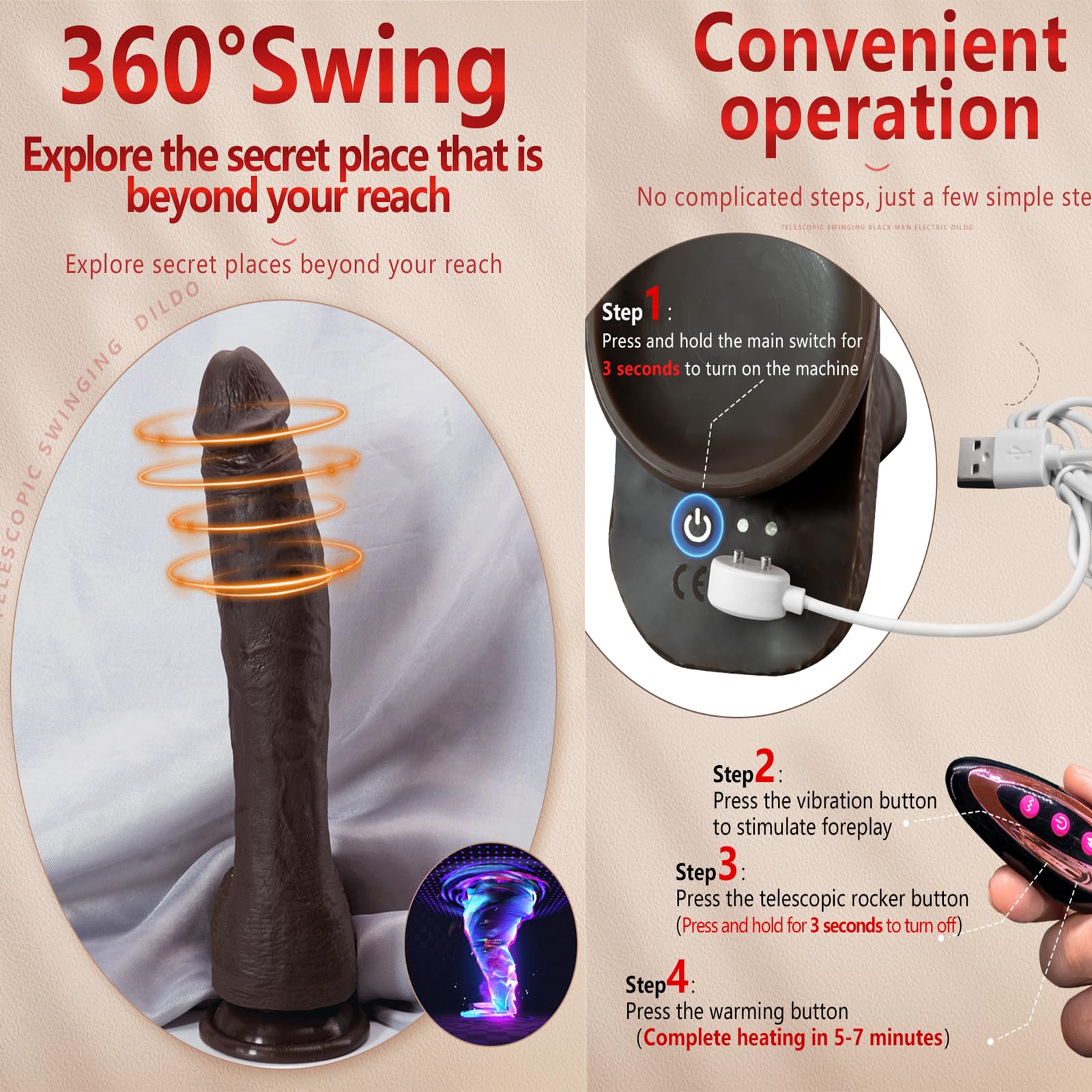 The dildo features a powerful suction cup base that allows for hands-free fun on any flat surface, such as toilet seats, bathtubs, or tiled floors, expanding your play options. Additionally, it includes a heating function that reaches 42°C, providing a lifelike body temperature experience for added realism and comfort during intimate moments.